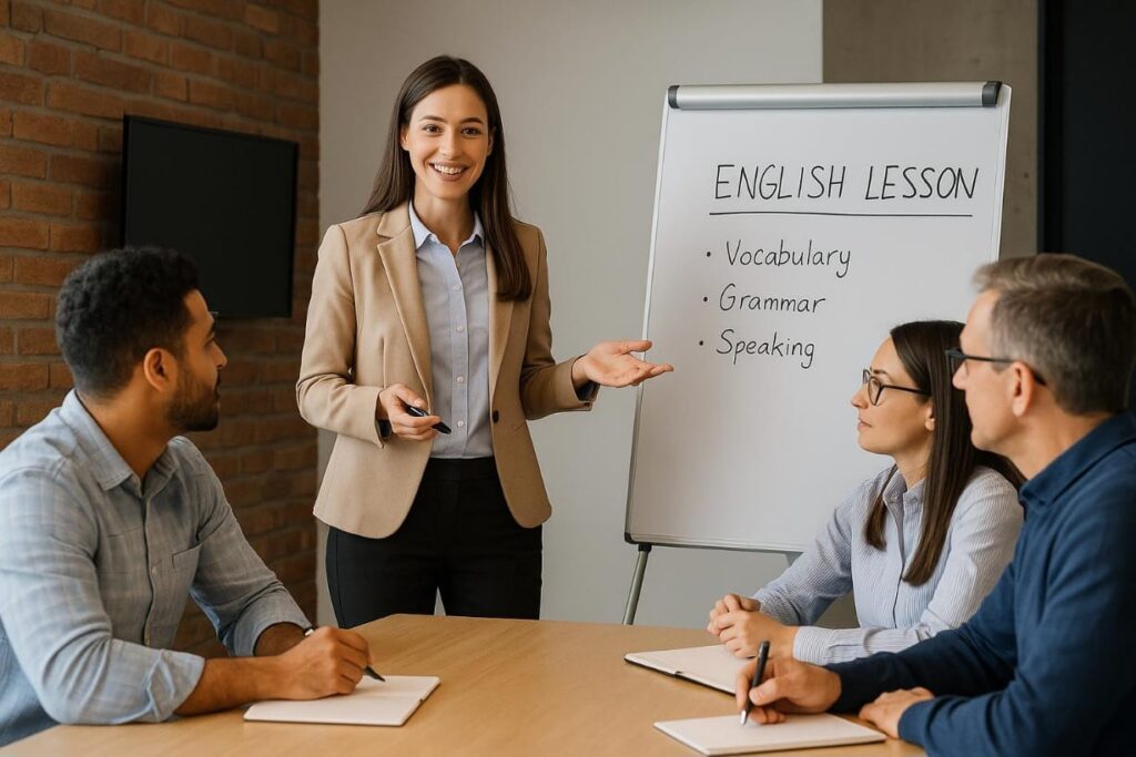 Zlepšete angličtinu ve firmě! Firemní lekce jsou přizpůsobené vašim potřebám a pomohou vám komunikovat efektivně v práci. Procvičíte odbornou slovní zásobu, mluvení i psaní v reálných pracovních situacích a získáte větší sebevědomí.